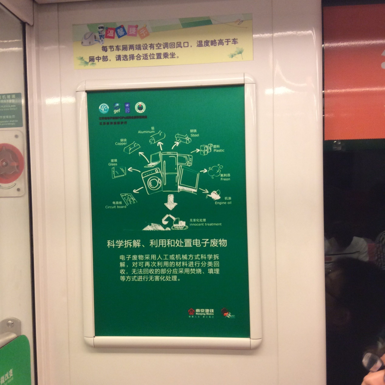 此次以电子废物POPs减排为主题的地铁“环保号”宣传,主要围绕“科学拆解利用和处置电子废物”、“电子废物资源化价值高”、“电子废物处理不当危害大”三项内容,通过宣传画报展示电子废物科学无害化处理方式、再利用价值及不当处理所产生的环境污染问题等。宣传内容图文并茂、通俗易懂,让广大居民认识到电子废物是一种放错位置的资源,统一回收、集中处置是减少垃圾、节约资源、保护环境的重要措施。